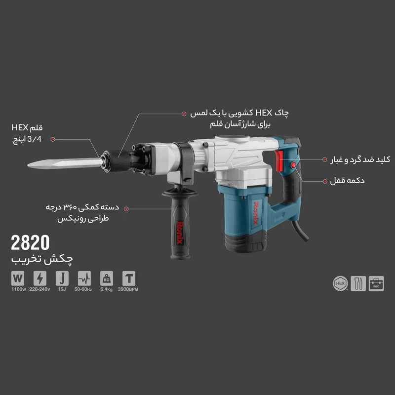 چکش تخریب رونیکس مدل 2820 با موتور قدرتمند 1100 وات و توان ضربه 15 ژول انتخابی ایدهآل برای عملیات تخریب سبک تا نیمهسنگین در پروژههای ساختمانی است. این چکش با گیربکس صنعتی مجهز به محفظه آلومینیومی ریختهگری شده که موجب کاهش حرارت و افزایش دوام دستگاه میشود، طراحی شده است. ابزارگیر 6 گوش (HEX) امکان استفاده از قلمهای مختلف را فراهم میکند که با نرخ ضربه 3900 ضربه در دقیقه کارایی بالایی ارائه میدهد.